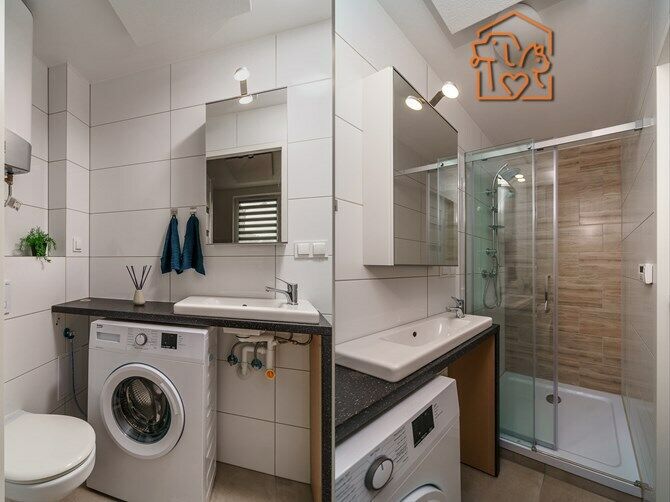 Łazienka razem z WC: lustro z półką, kabina prysznicowa, pralka.