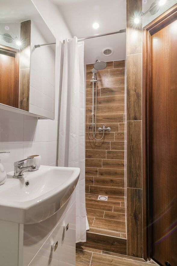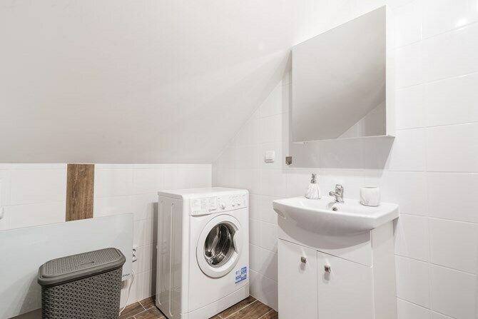 Łazienka z WC: prysznic, pralka, umywalka, bojler elektryczny.
