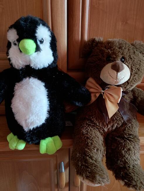 Pluszaki Miś i pingwin,długość pingwina 35cm, miś około 45cm.Cena 20 zł za sztukę.Mozliwy odbiór osobisty Kraków