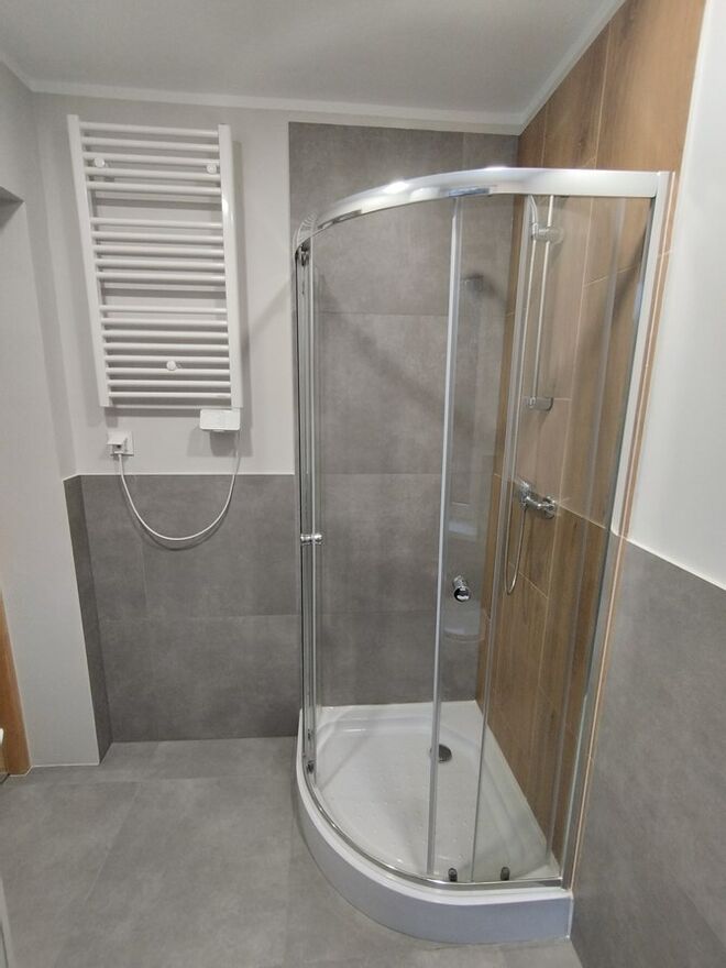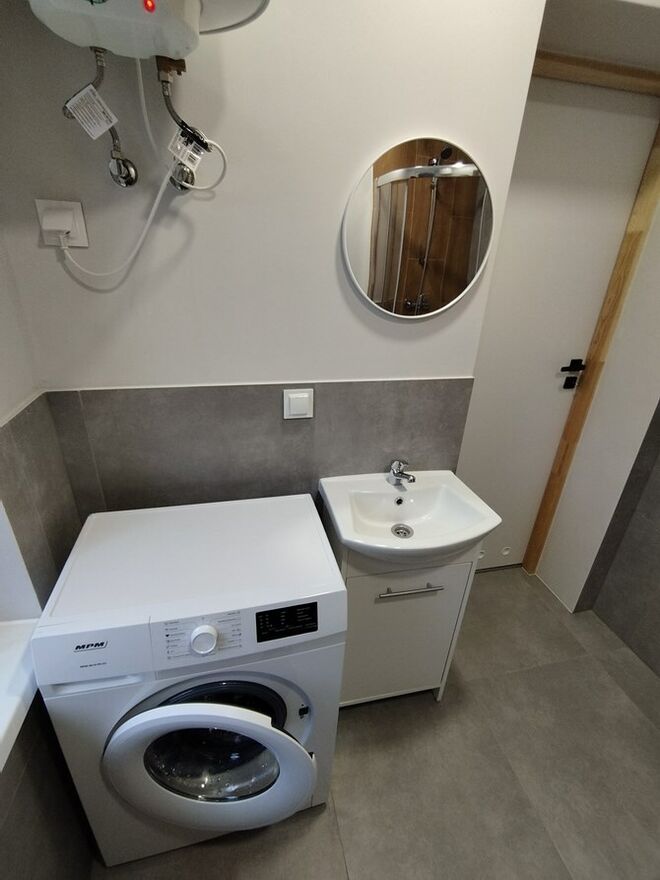 Łazienka: kabina prysznicowa, pralka, umywalka, WC.