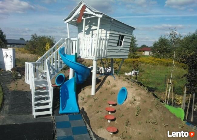 Domek może być osadzony na drewnianych balach, połączony z huśtawką, ślizgiem,piaskownicą, ścianą wspinaczkową