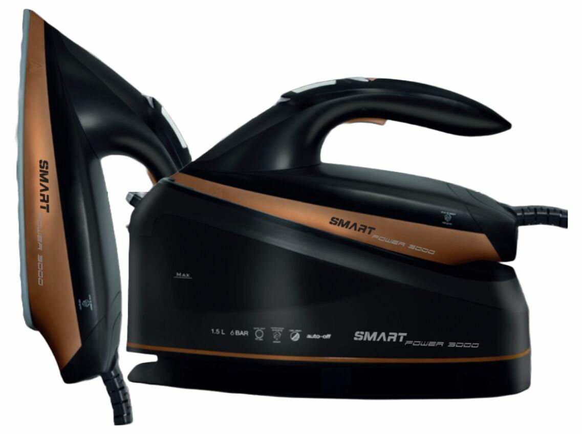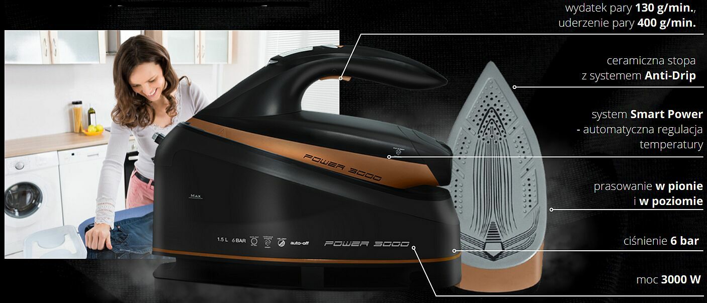 Prasuj szybciej i dokładniej:Generator pary o potężnej mocy i silnym uderzeniu pary. Umożliwia prasowanie zarówno w pionie, jak i w poziomie. Prasowanie jest niezwykle łatwe i efektywne za sprawą wygodnego uchwytu żelazka oraz ergonomicznie umieszczonego przycisku wyrzutu pary. Funkcja Smart Power sprawia, że urządzenie samoczynnie dobiera odpowiednią temperaturę do różnych rodzajów tkanin. Funkcja Quick Start zapewnia błyskawiczną gotowość do pracy. System anti-drip chroni przed kapaniem. Walorów urządzenia dopełnia wysmakowany, ekskluzywny design.