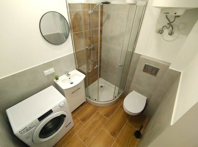Łazienka razem z WC: kabina prysznicowa, lustro