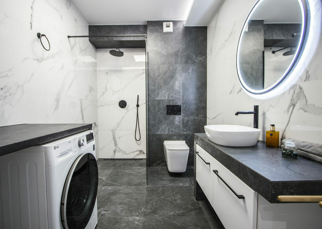 - Łazienka z WC: kabina prysznicowa walk-in, umywalka z szafką, lustro, pralko-suszarka,