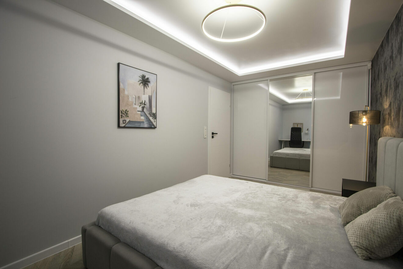 - Osobna, zamykana sypialnia: 2 osobowe, duże wygodne łóżko, pojemna szafa w zabudowie, szafki nocne, biurko i krzesło.