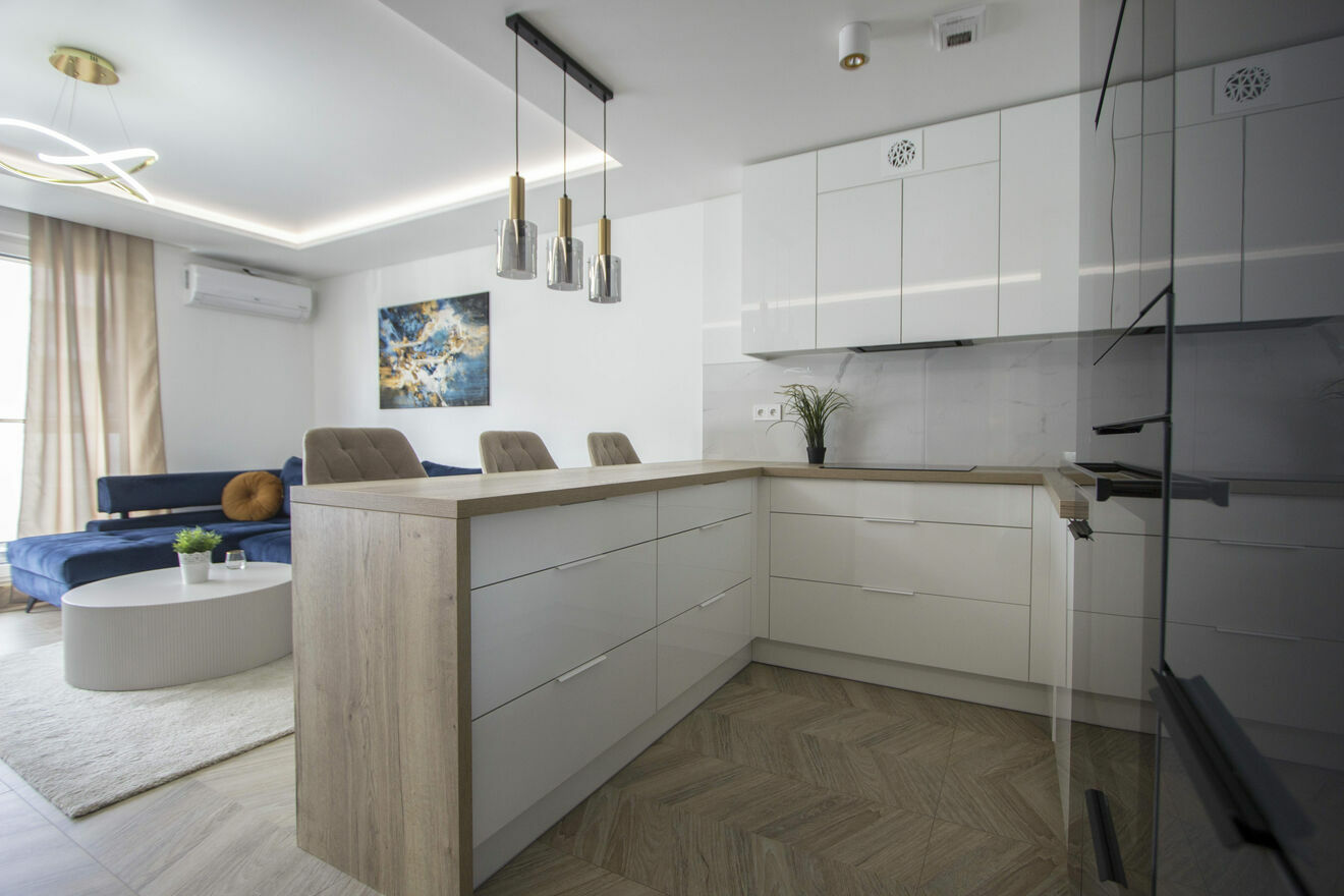 - Kuchnia wyposażona w wszystkie niezbędne sprzęty: szafki, zlew, lodówka, płyta grzewcza, piekarnik, zmywarka, okap.