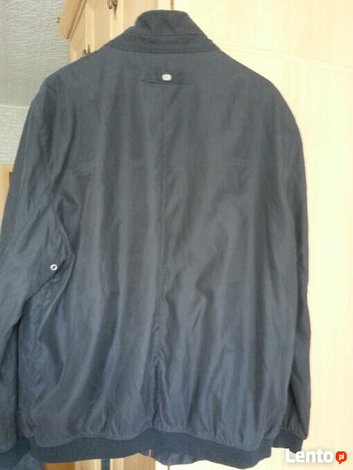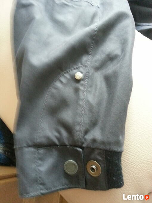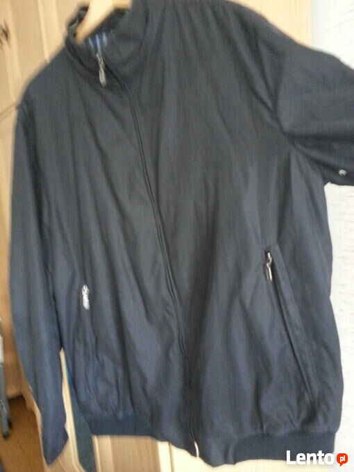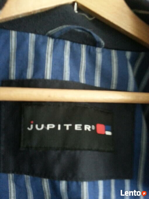 Kurtka mocno granatowa firmy JUPITER. Nieprzemakalna, od wewnątrz tkanina śliska. Wymiary; długość 76 cm., dł. rękawa od ramion 65 cm., obwód w kl.piersiowej 132 cm., szerokość w ramionach 54 cm. Liczne kieszenie wewnętrzne, dwie na zewnątrz na suwaki. U dołu kurtki elastyczny ściągacz. Można prać w automacie. Stan idealny.Grażyna