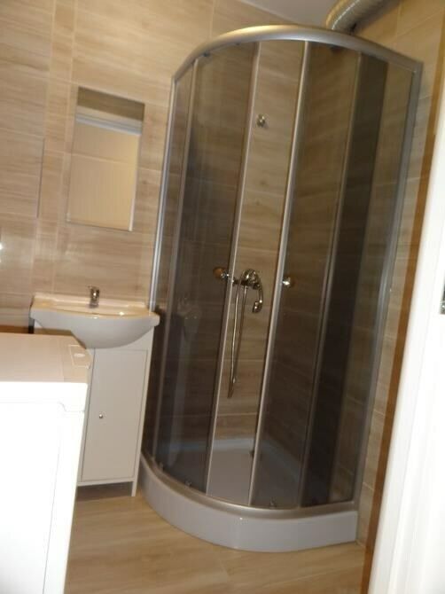 Łazienka: kabina prysznicowa, pralka, umywalka i WC.