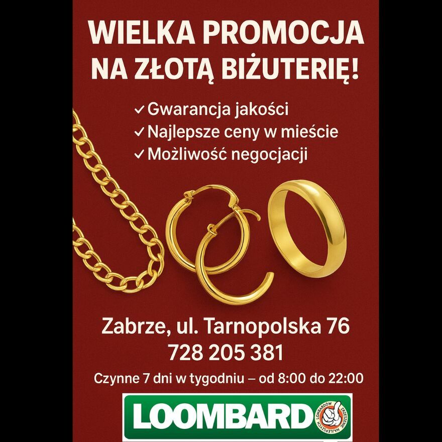 Marzysz o wyjątkowych dodatkach w atrakcyjnej cenie?Teraz w LOOMBARD Tarnopolska 76 Zabrze znajdziesz złotą biżuterię w super promocjach!