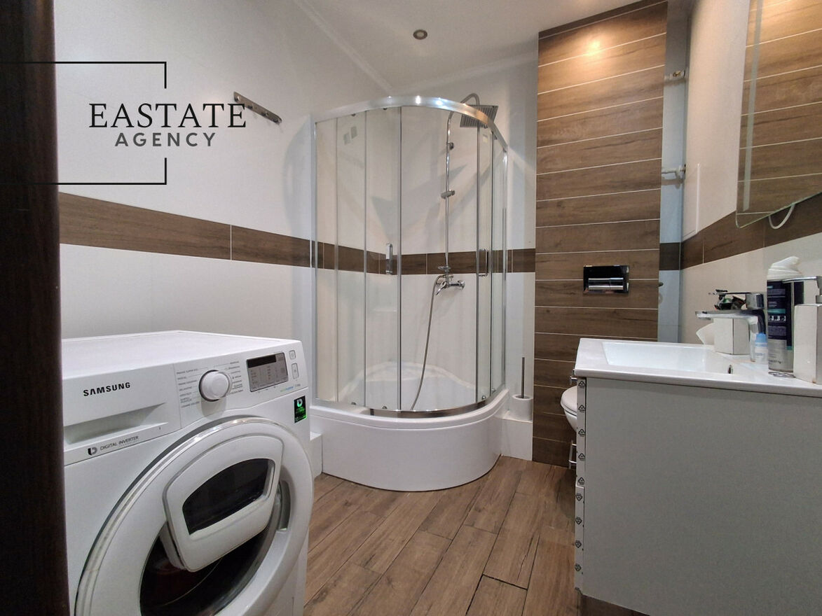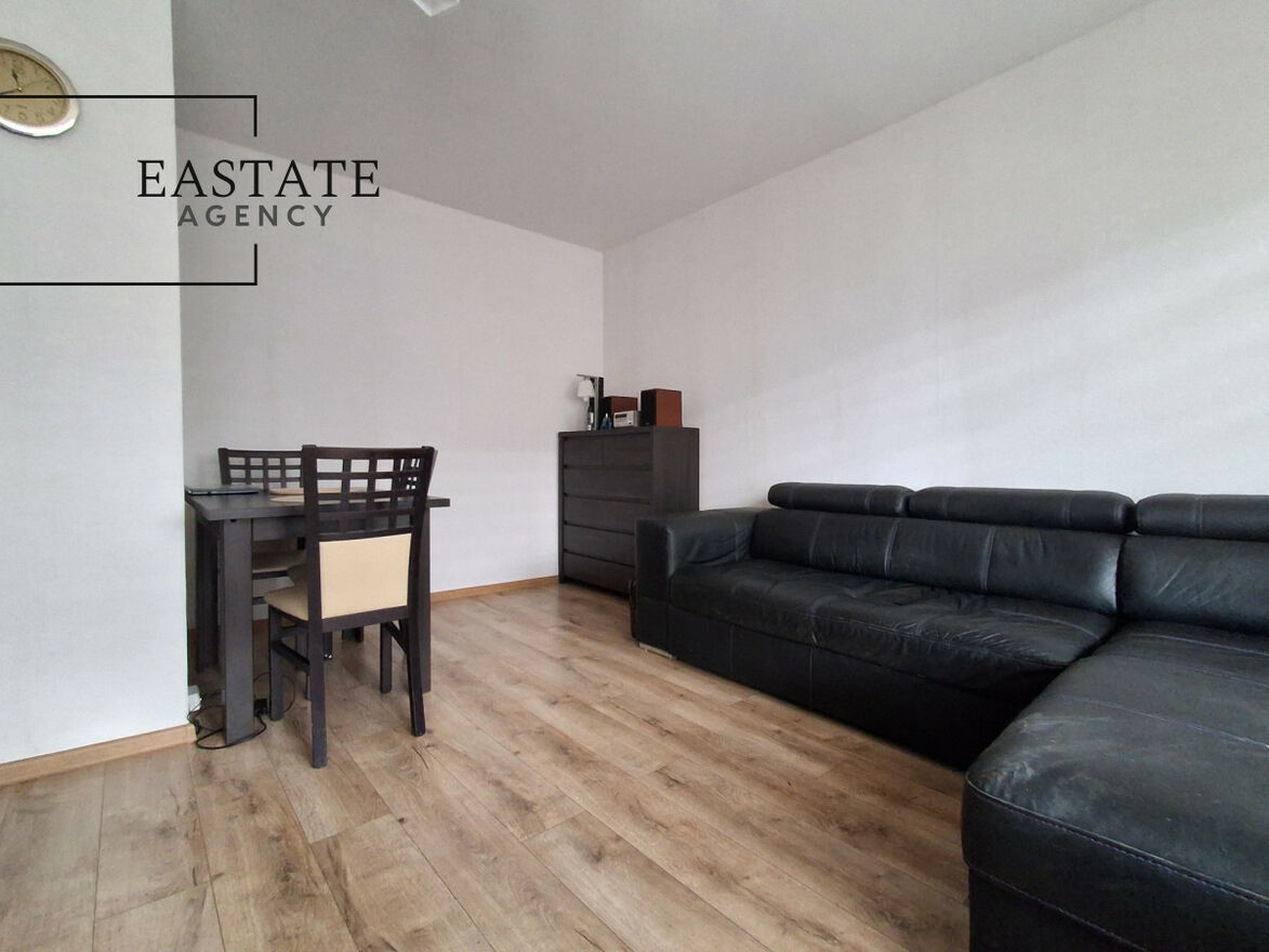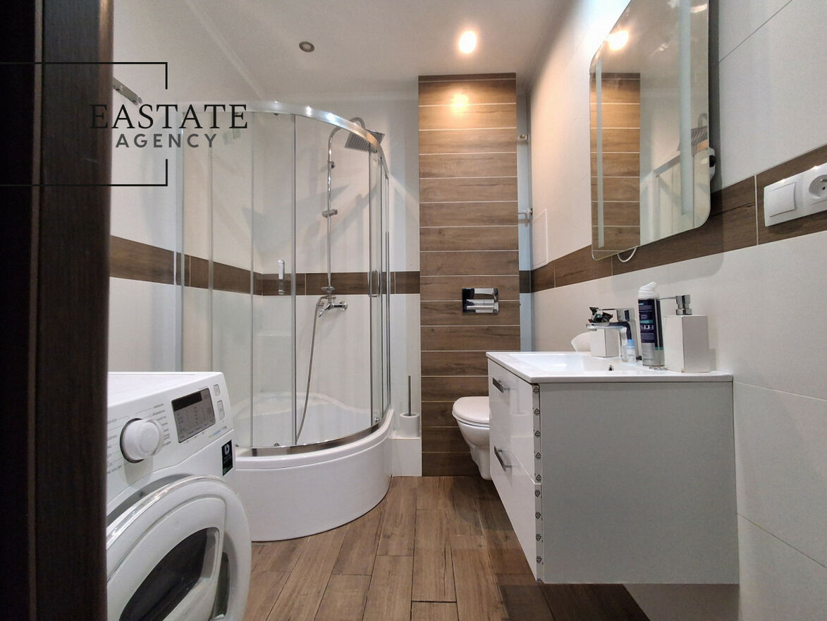 Przestronny salon wyposażony w duży narożnik, komody oraz wydzieloną część jadalną ze stołem i krzesłami. Drugi pokój umeblowany w regał oraz kanapę, idealny jako sypialnia lub gabinet. W przedpokoju znajdują się szafy w zabudowie, a kuchnia jest w pełni wyposażona w meble i sprzęt AGD; łazienka z prysznicem i pralką.
