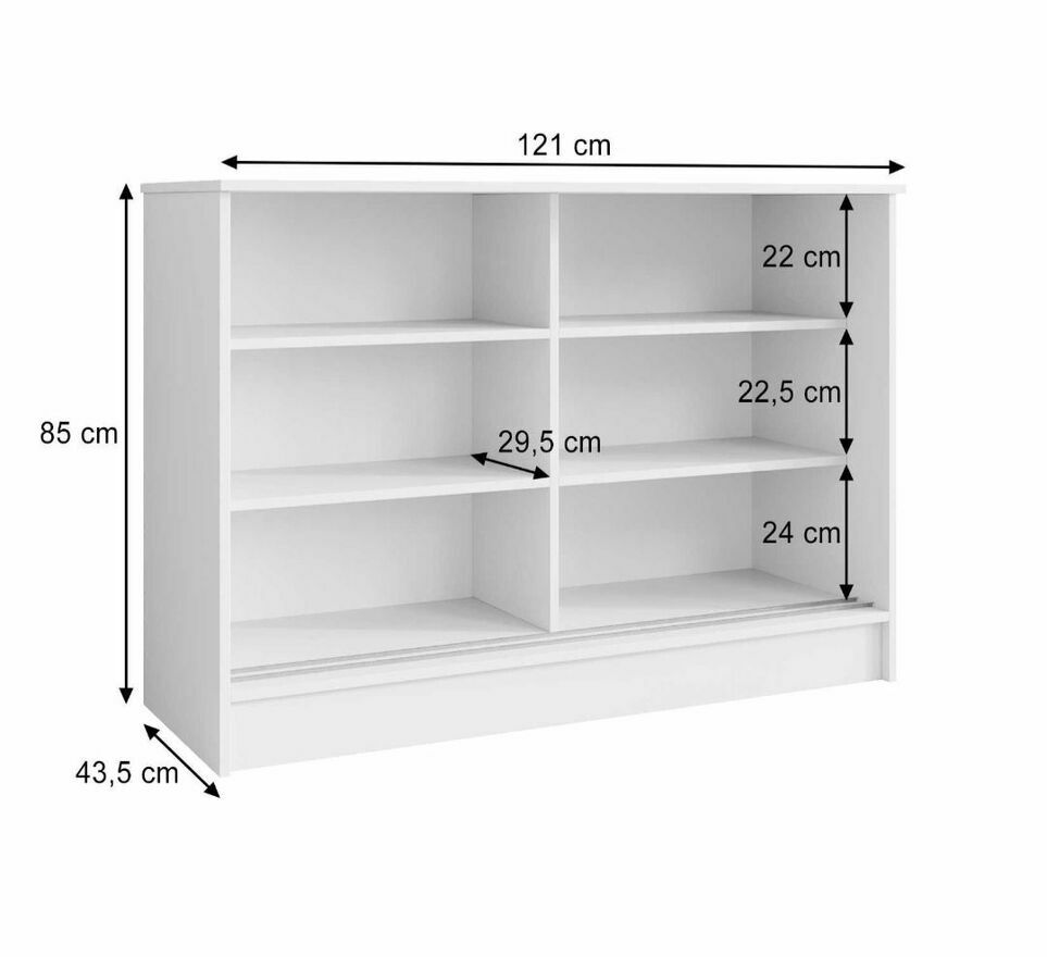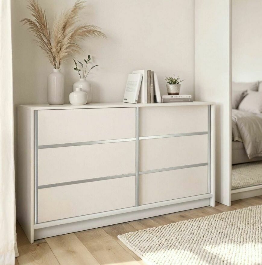 Nowoczesna, pojemna komoda w kolorze białym. Idealna do przechowywania ubrań, bielizny lub innych przedmiotów w sypialni lub salonie. Wymiary 120 cm długości zapewniają dużą przestrzeń na przechowywanie. Komoda pasuje do minimalistycznego, nowoczesnego wnętrza.Komoda nowa, pare dni temu złożona ale niestety za mala.