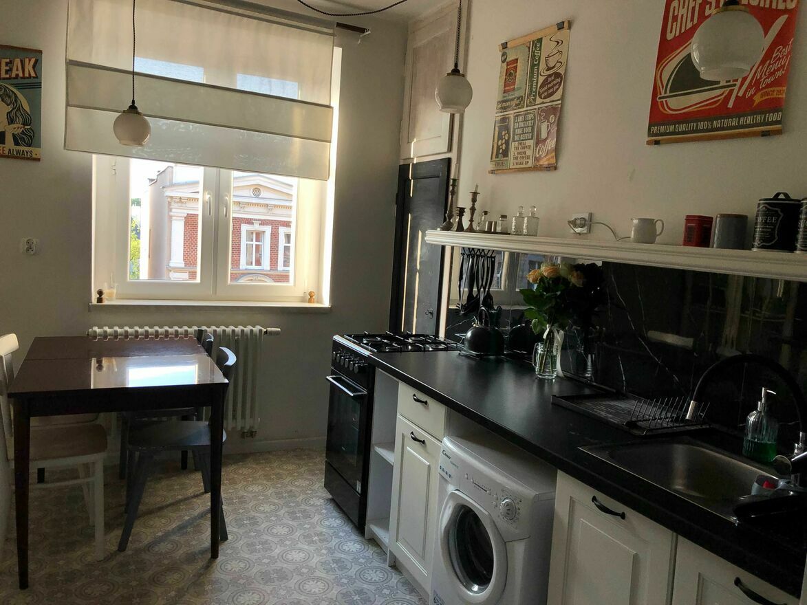 Kuchnia przestronna wyposażona w lodówkę z zamrażarką, piekarnik, mikrofalówkę, pralkę, stolik z krzesłami, wyposażona w niezbędne rzeczy tj. czajnik, talerze, szklanki, sztućce, garnki, w kuchni jest także spiżarka.