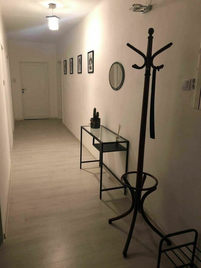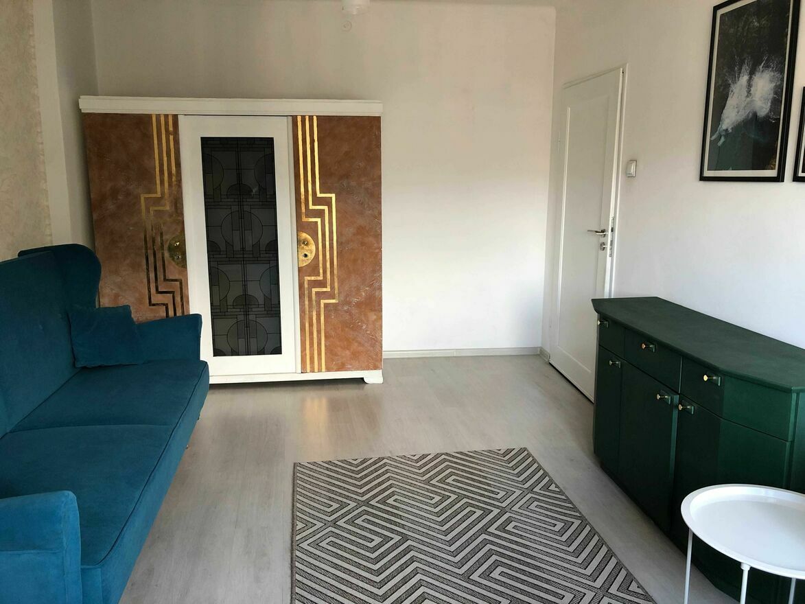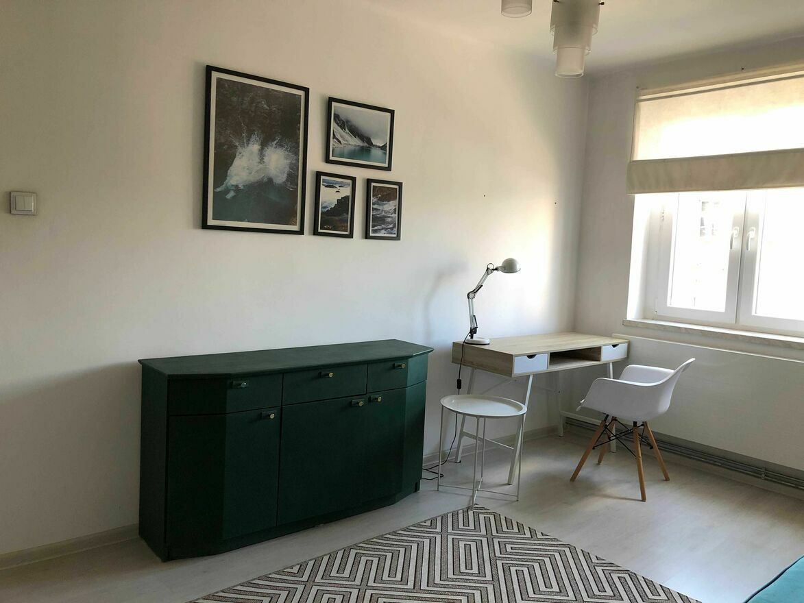 Mieszkanie ma 80m2. W pokoju jest duża, wygodna, rozkładana kanapa, szafa, komoda, biurko, lampka, krzesło do biurka.