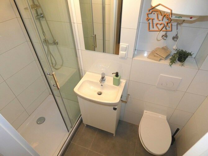 Łazienka razem z WC: lustro z półką, kabina prysznicowa.