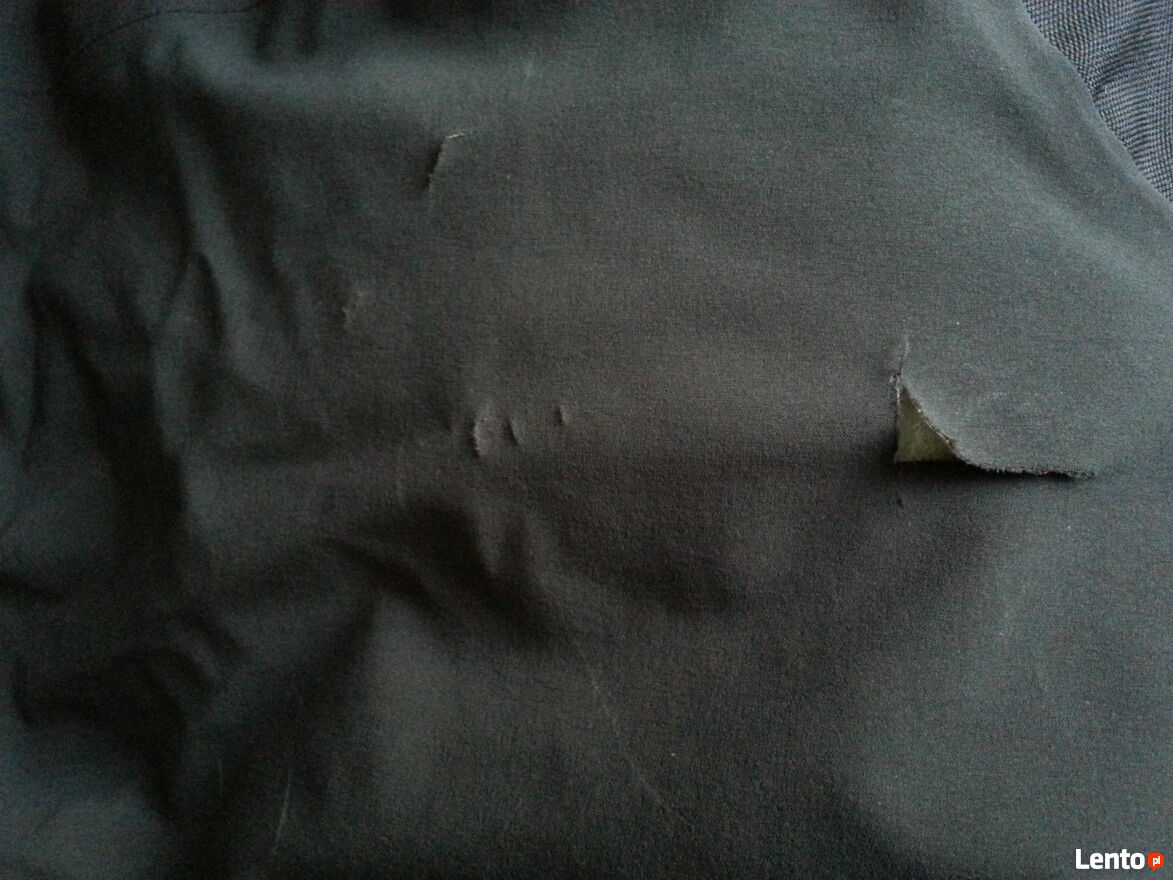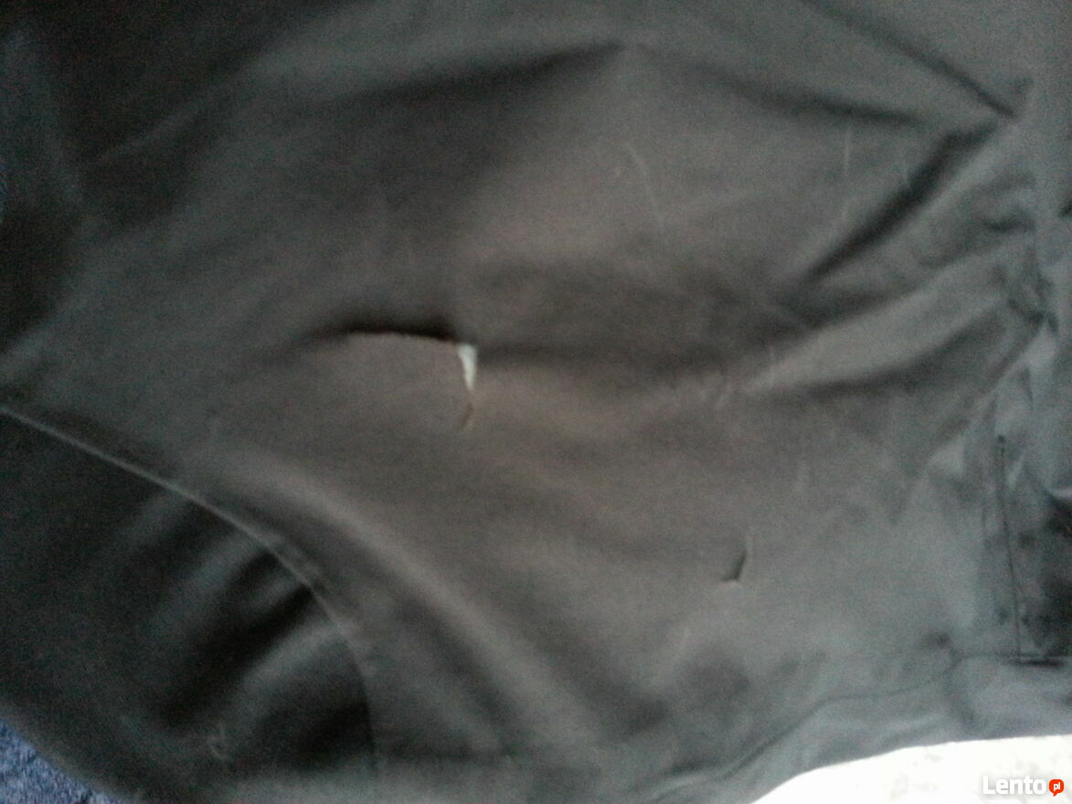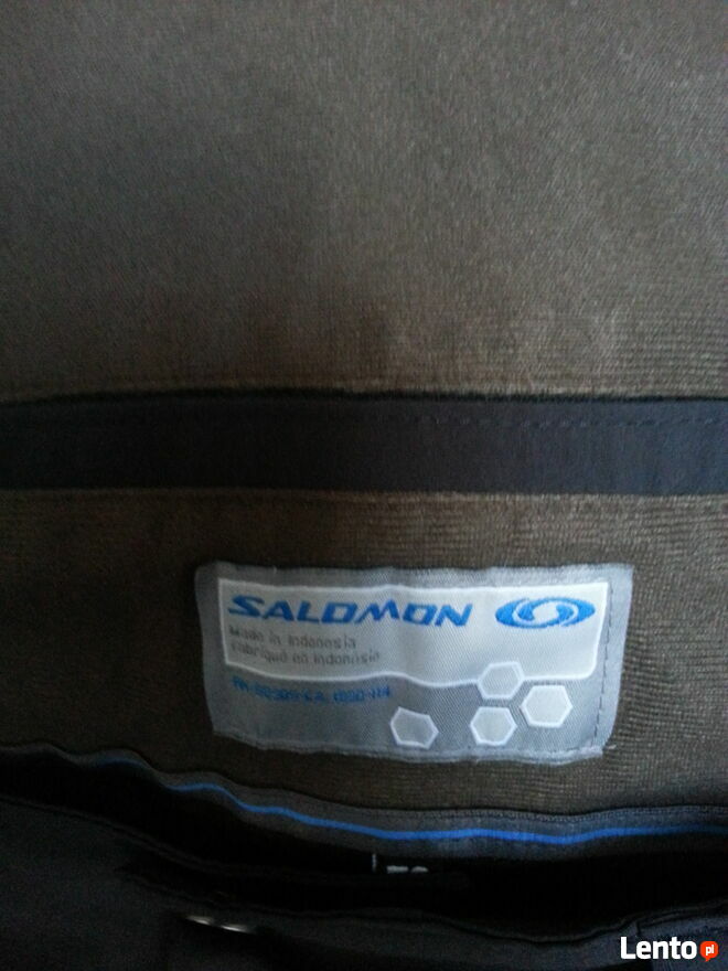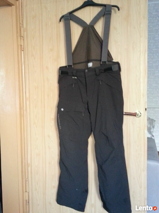 Spodnie czarne, snowboardowe firmy Salomon. Rozmiar 56. wymiary; dł. 112 cm., obwód max. w pasie max. 106 cm., dł. nogawki od kroku 87 cm., szer. nogawki w kroku 34 cm. Regulacja w pasie na zatrzaski. Pięć kieszeni na suwaki i z klapką na rzep. Ciepłe, wodoodporne. Drobniutkie uszkodzenia tkaniny, nie widoczne gołym okiem (od nart), na dole nogawek i jedno rozerwanie na 2,5 cm. (ostatnie foto), Reszta bez zarzutu łącznie z szelkami (odpinane).Grażyna
