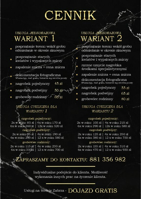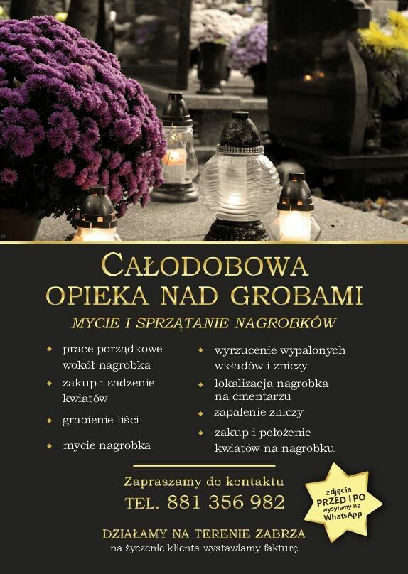Zajmuje się całoroczną opieką nad grobami. W zakresie moich usług znajduje się: sprzaranie terenu wokół grobu w okresie zimowym także odśnieżanie, mycie nagrobku,usunięcie starych kwiatiw czy wypalonych zniczy, zakup i sadzenie kwiatow, grabienie liści.Wykonuje usługi jednorazowe jak cykliczne, dokumentacja fotograficzna Przed i Powysyłana na maila WhatsApp bądź na maila.