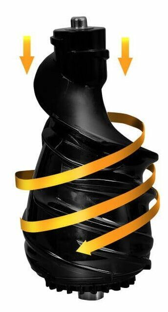 Urządzenia linii GSJ-630 wyposażone są w dwa otwory wlotowe: tuba wlotowa z szerokim otworem ułatwia aplikowanie większych produktów, z kolei wąska sprawdzi się przy podłużnych warzywach, jak marchew. Ślimak o unikatowym, wydłużonym kształcie ułatwia pobieranie wrzucanych cząstek bez potrzeby używania popychacza. Ergonomiczne korki w misie zapobiegają kapaniu i umożliwiają mieszanie soków z różnych produktów. Gdy jakaś cząstka utknie w misie, bez problemu odblokujesz ją wykorzystując bieg wsteczny.