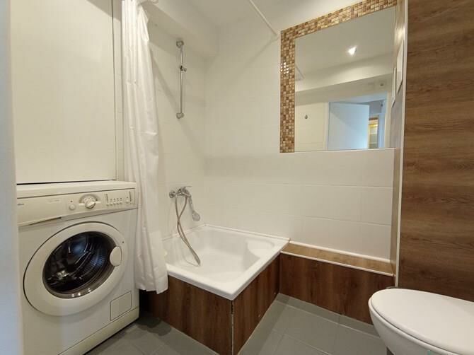 Łazienka: kabina prysznicowa, WC, umywalka i pralka.
