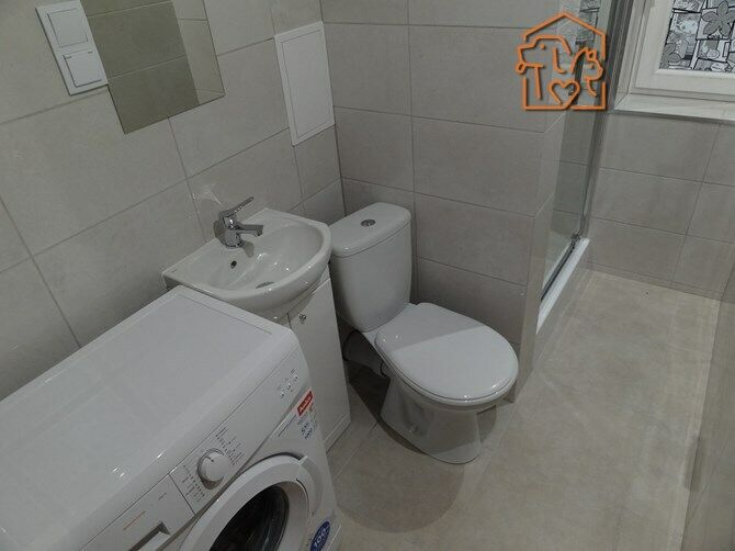 Łazienka: kabina prysznicowa, umywalka, pralka i WC